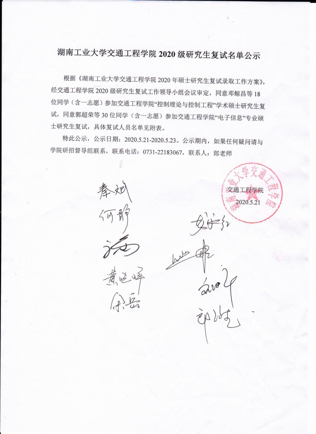 湖南工业大学交通工程学院2020级研究生复试名单公示