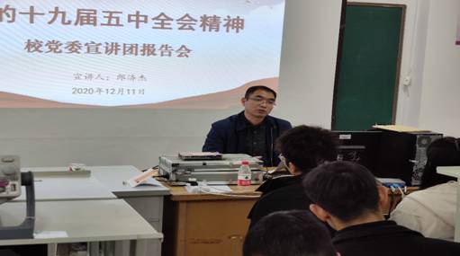 本次党课围绕党的十九届五中全会的意义、总结“十三五”取得的成就、“十四五”中国经济社会发展主要目标、经济发展取得新成效四个方面进行了宣讲。报告最后,郎书记号召全体学生要认真学习党的十九届五中全会会议精神,在思想上积极向党中央靠拢,努力争取在所学的学科领域有所成就。
