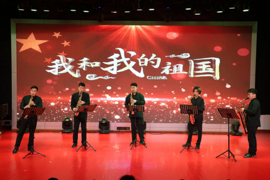 程佳波、余晟鹏老师,以及武天泽、张佳乐、耿博翔同学用一首萨克斯五重奏版《我和我的祖国》,将爱国之情融入萨克斯的旋律中,希望同学们毕业后投入建设祖国的事业中,乘百舸争流之势,续中华民族之魂。
