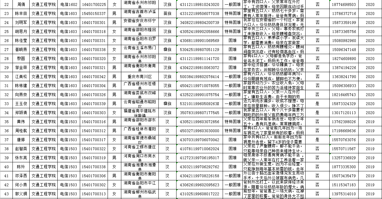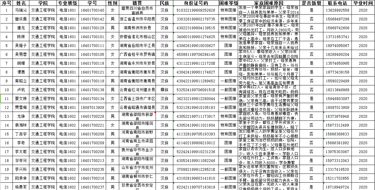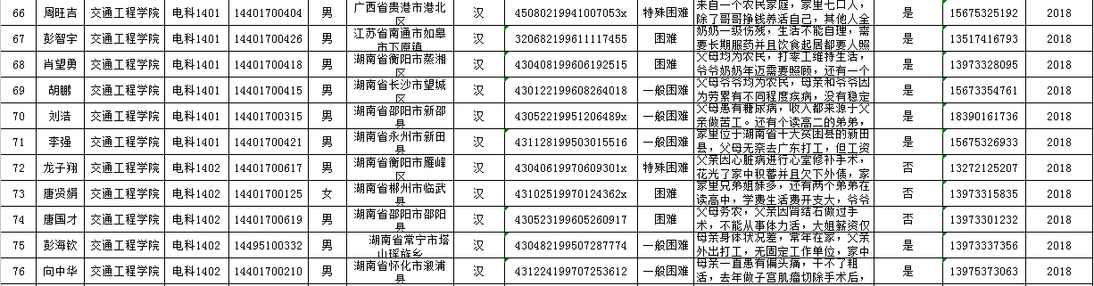 为了更好地贯彻落实国家资助政策,确保各项资助政策和措施真正落实到家庭经济困难学生身上,根据《教育部办公厅关于进一步加强和规范高校家庭经济困难学生认定工作的通知》(教财厅[2016]6号)和《湖南工业大学家庭经济困难学生认定办法》相关条例,现学院自通知下发之日,完成2017年春季经济困难学生认定异动工作,现公示如下: