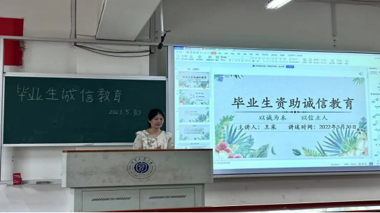 王采老师引用自身经历,向同学们介绍了诚信的内涵和重要性并解释了国家助学贷款的目的和含义。王老师指出,有了国家的助学贷款,同学们得以顺利圆自己的大学梦,希望同学们毕业后心存感激、积极进取、立志成才、回报社会。随后,王老师围绕助学贷款还款流程和操作程序展开讲述,为所有生源地助学贷款毕业生普及了相关金融知识和信用知识,让应届贷款毕业生充分认识到个人应该承担的贷款责任和义务以及违约对个人信用造成的严重危害。最后,王采老师通过播放国家开发银行的资助宣传视频让大家进一步明确如何正确还款及不同情况下的多种还款方式,鼓励大家积极还款,将诚信为本、守信光荣、失信可耻作为基本要求,把诚信落到实处、将诚信转化为一种自觉。