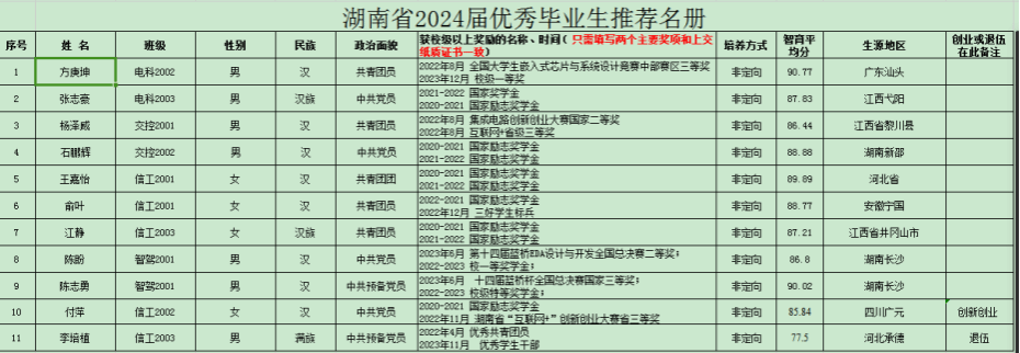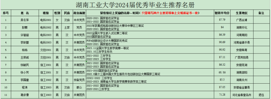 根据《关于开展湖南工业大学2024届省级优秀毕业生、校级优秀毕业生评选工作的通知》的有关要求,经个人申请,班级推荐,学院2024届优秀毕业生评选工作小组对参评学生资格进行审核,学院党政联席会议一致通过,评选出 方庚坤 等 11名同学(排名不分先后)作为2024届省级“优秀毕业生”推荐人选,评选出吴冬萍等 11名同学(排名不分先后)作为2024届校级“优秀毕业生”推荐人选。
