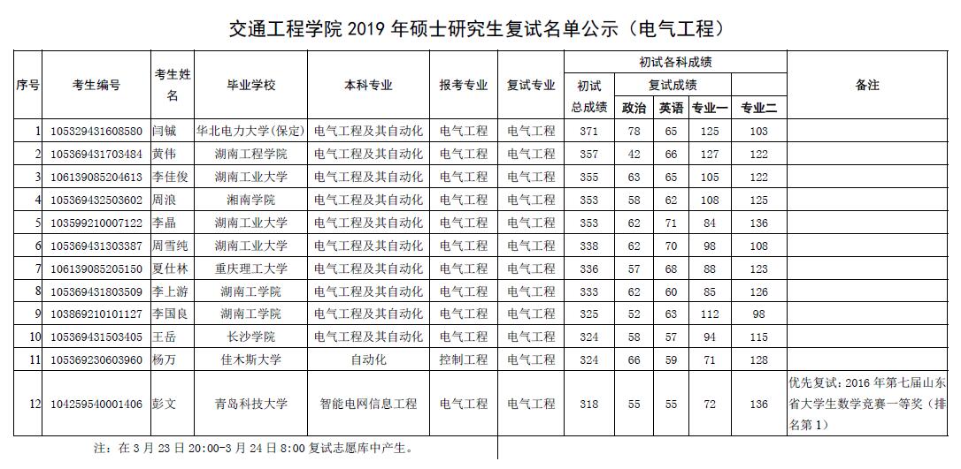 交通工程学院2019年硕士研究生复试名单公示表(电气工程)