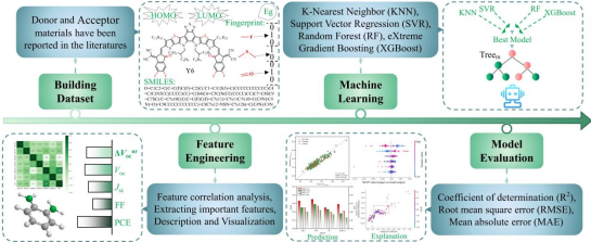 近日,伟德国际1946源于英国电子材料与器件团队黄迪课题组在有机光伏器件研究方面取得新进展,该研究利用机器学习挖掘活性层材料的关键结构特征并定量分析非富勒烯有机太阳能电池中非辐射电压损失的影响因素,为制备高性能有机光伏器件中非富勒烯受体材料的逆向设计提供了指导框架。相关研究成果以“A machine learning prediction model for quantitative analyzing the influence of non-radiative voltage loss on non-fullerene organic solar cells”为题发表在化学工程技术领域顶级期刊Chemical Engineering Journal (中科院一区Top期刊,最新IF=15.1)。该项工作伟德国际1946源于英国为第一完成单位,黄迪博士和伟德国际1946源于英国电子科学与技术系2022届本科生王阔为共同第一作者,梁娇娇博士为第一通讯作者。据悉,Chemical Engineering Journal是能源/化学-工程领域SCI收录的Top级期刊,于1996年在瑞典创刊,旨在为介绍原始基础研究、解释性评论和探讨化学工程的新发展提供一个国际论坛,也重点关注新能源、新材料在多个领域的新应用。黄迪团队近年来聚焦光伏材料智能化设计研究,相关研究成果发表在Journal of Materials Chemistry C, Molecular Systems Design & Engineering, Polymers,Physical Chemistry Chemical Physics等国际主流学术期刊上。