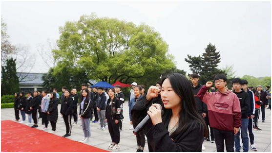 随后,全体成员向革命烈士进献鲜花,表达对先烈的追思。进献鲜花完毕后,全体成员面对纪念碑三鞠躬并低头默哀一分钟,缅怀先烈。默哀结束,吴璇子带领大家宣读入团誓词,在她的引导下,大家重温入团誓词,更加坚定昔日入团理想。