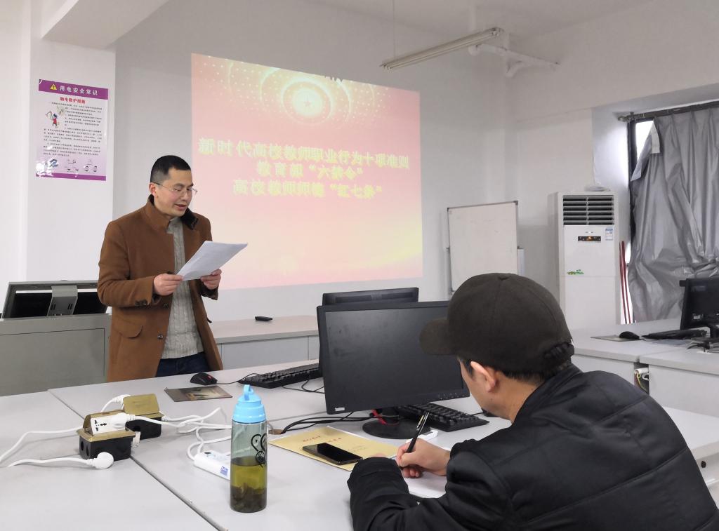 会议伊始,院长龙永红同志总结了过去一年学院所取得的成绩,介绍了学院今年新引进的6位博士,并对本学期的各项重点工作做了大致部署。接着由学院其它院领导分别就各自分管工作做了简要部署。最后,由副院长黄晓峰同志带领全院老师共同学习了新时代高校教师职业行为十项准则,教育部“六禁令”,高校教师师德“红七条”,切实传达了教育部精神。