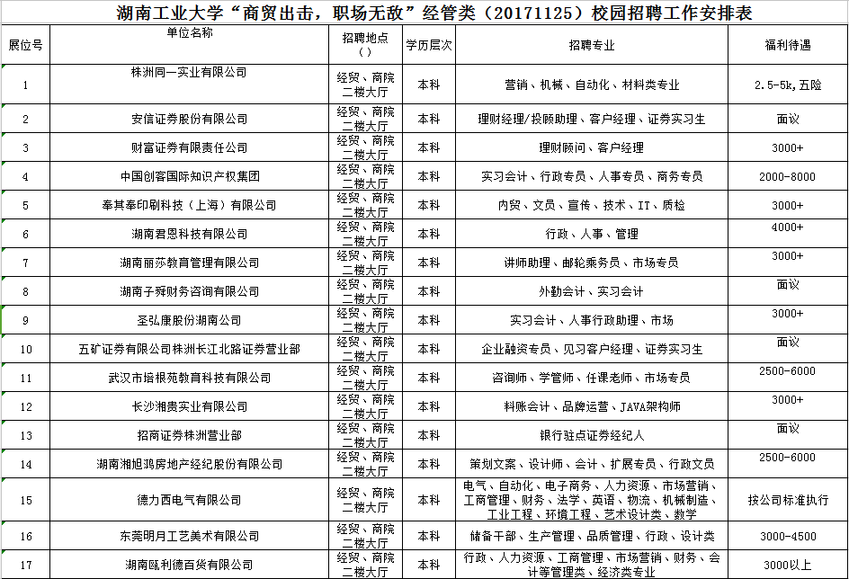湖南工业大学“商贸出击,职场无敌”经管类(20171125)校园招聘工作安排表