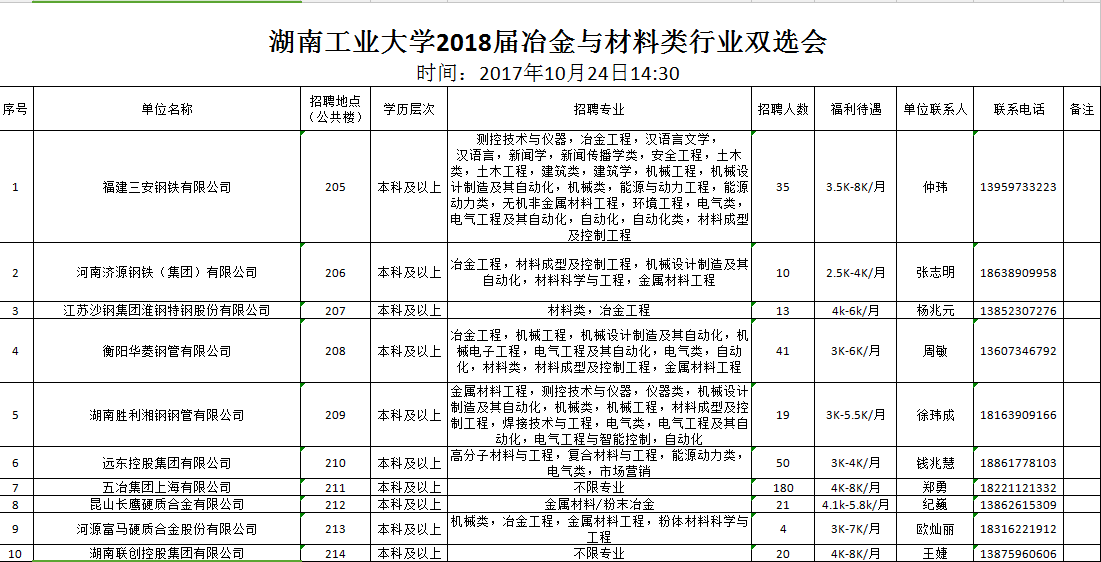 湖南工业大学第八周(20171024)校园招聘工作安排表