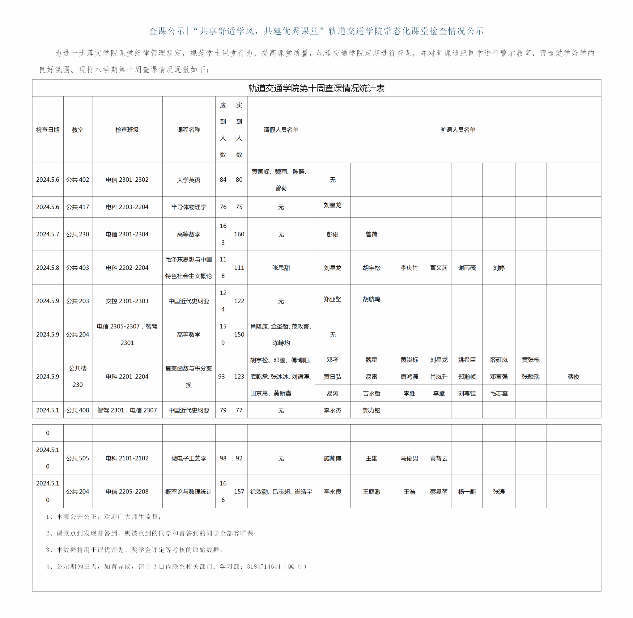 查课公示|“共享舒适学风,共建优秀课堂”伟德国际1946源于英国常态化课堂检查情况公示(第十周)