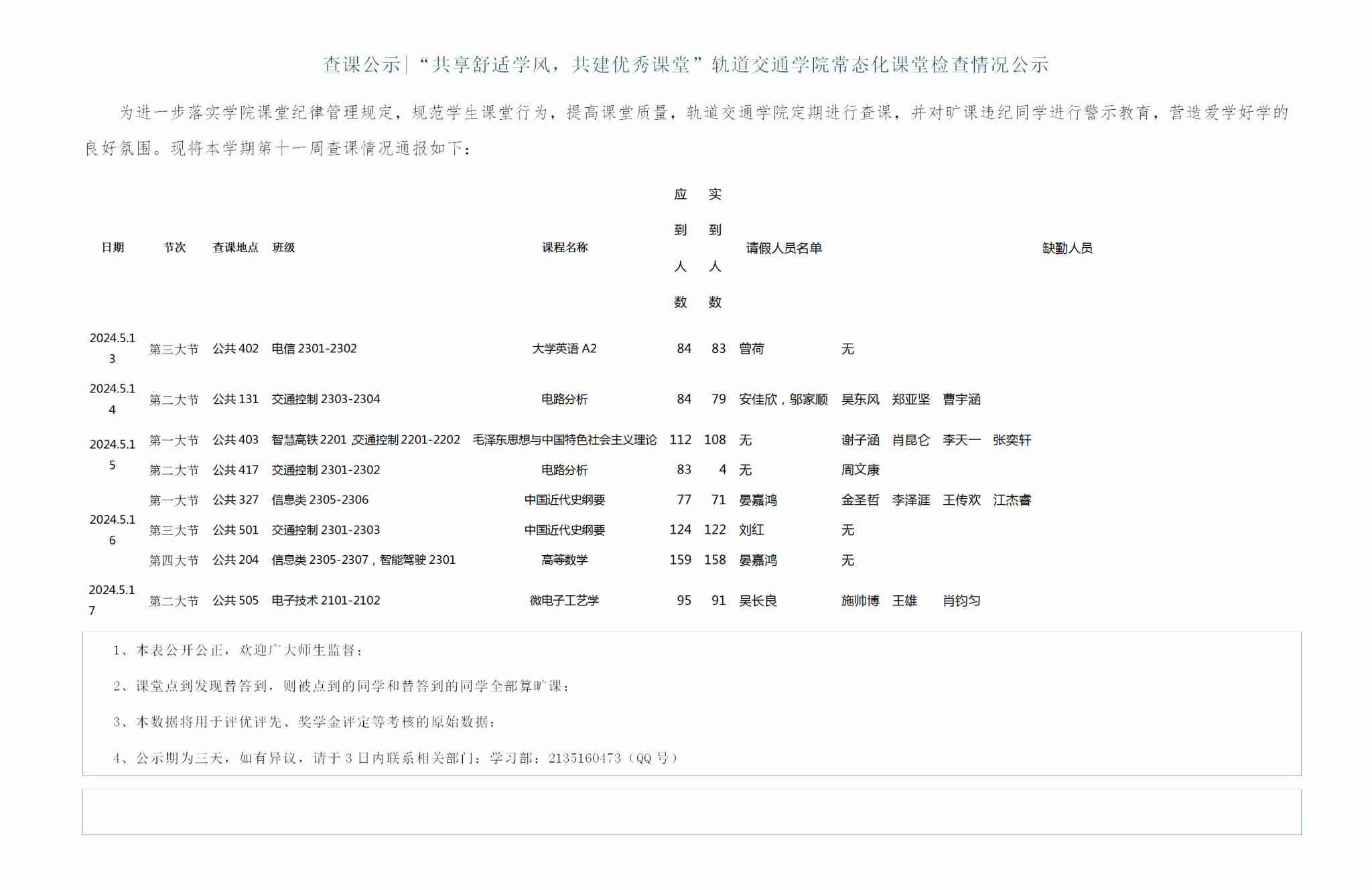 查课公示|“共享舒适学风,共建优秀课堂”伟德国际1946源于英国常态化课堂检查情况公示(第十一周)