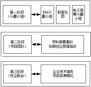 第一阶段,双创班共组建了EDA兴趣小组、极客社团、电子设计小组和嵌入式兴趣小组等4个兴趣小组,每个兴趣小组规模50人以上,学生覆盖率超过50%。每个兴趣小组每月必须开展2次活动,以小组为单位进行基础知识培养: